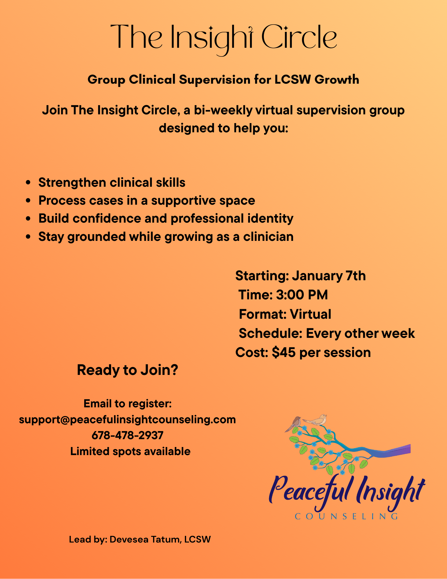 Led by Devesea Tatum, LCSW, our supervision sessions offer a collaborative and enriching environment where you can strengthen your clinical skills, gain deeper insight into case conceptualization, and develop confidence in your ability to serve diverse populations effectively.